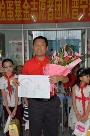 在捐贈(zèng)儀式上,洪江游先生代表康芝紅臉蛋基金向軍屯小學(xué)贈(zèng)送“愛心共建學(xué)?!迸曝遥楹⒆觽儼l(fā)放愛心大禮包。孩子們則向洪董事長(zhǎng)獻(xiàn)上了鮮花和自己精心繪畫的美術(shù)作品。