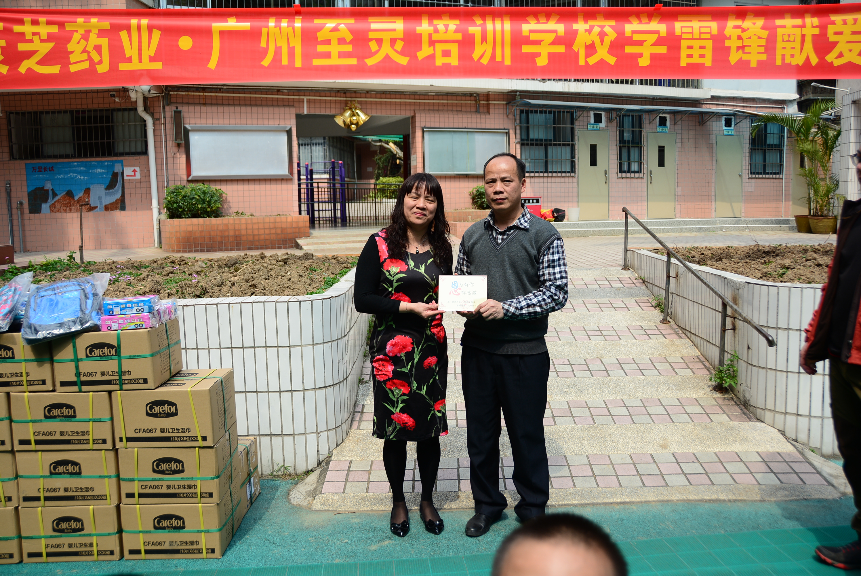 現場,至靈學校張校長向志愿者代表龍殿康先生贈送愛心牌,并向康芝紅臉蛋基金表示由衷的感謝。