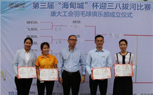 此次拔河比賽還穿插舉辦了康大工會羽毛球俱樂部成立儀式。儀式上,由海南康大投資有限公司副總經理、工會主席梁君先生為俱樂部第一屆會長林佳女士,第一屆副會長王春穎女士,女隊教練王虹蓉女士,男隊教練周義超先生頒發了聘任證書,并進行授旗。