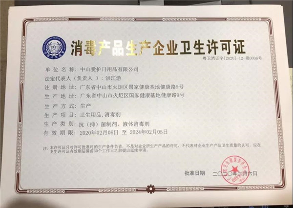 在此次應急項目上,愛護能在極短的時間內(nèi),迅速完成消毒水生產(chǎn)的申報資料并順利通過,獲得《消毒產(chǎn)品生產(chǎn)企業(yè)衛(wèi)生許可證》,得力于愛護擁有非常完善的生產(chǎn)管理體系,以及強大的配方儲備支持。