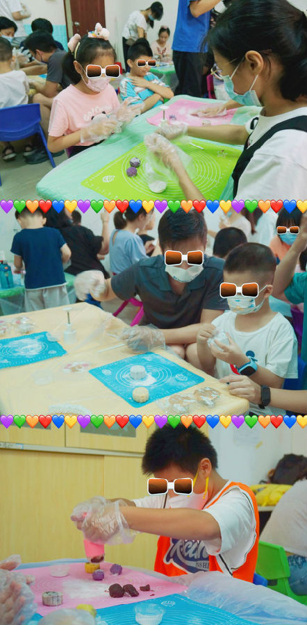 隨后,來自康芝紅臉蛋基金的志愿者們手把手指導孩子們怎么制作冰皮月餅。首先將原材料冰皮月餅粉和水按比例混合,等各位小朋友都完成這個步驟后,志愿者們手把手教小朋友們將粉團揉至光滑狀態,再加入不同的果蔬粉,五顏六色營養又健康的小面團就揉好了,最后加入孩子們自己喜歡的餡料,放進模具里,一只只可愛的冰皮月餅就制作完成啦!