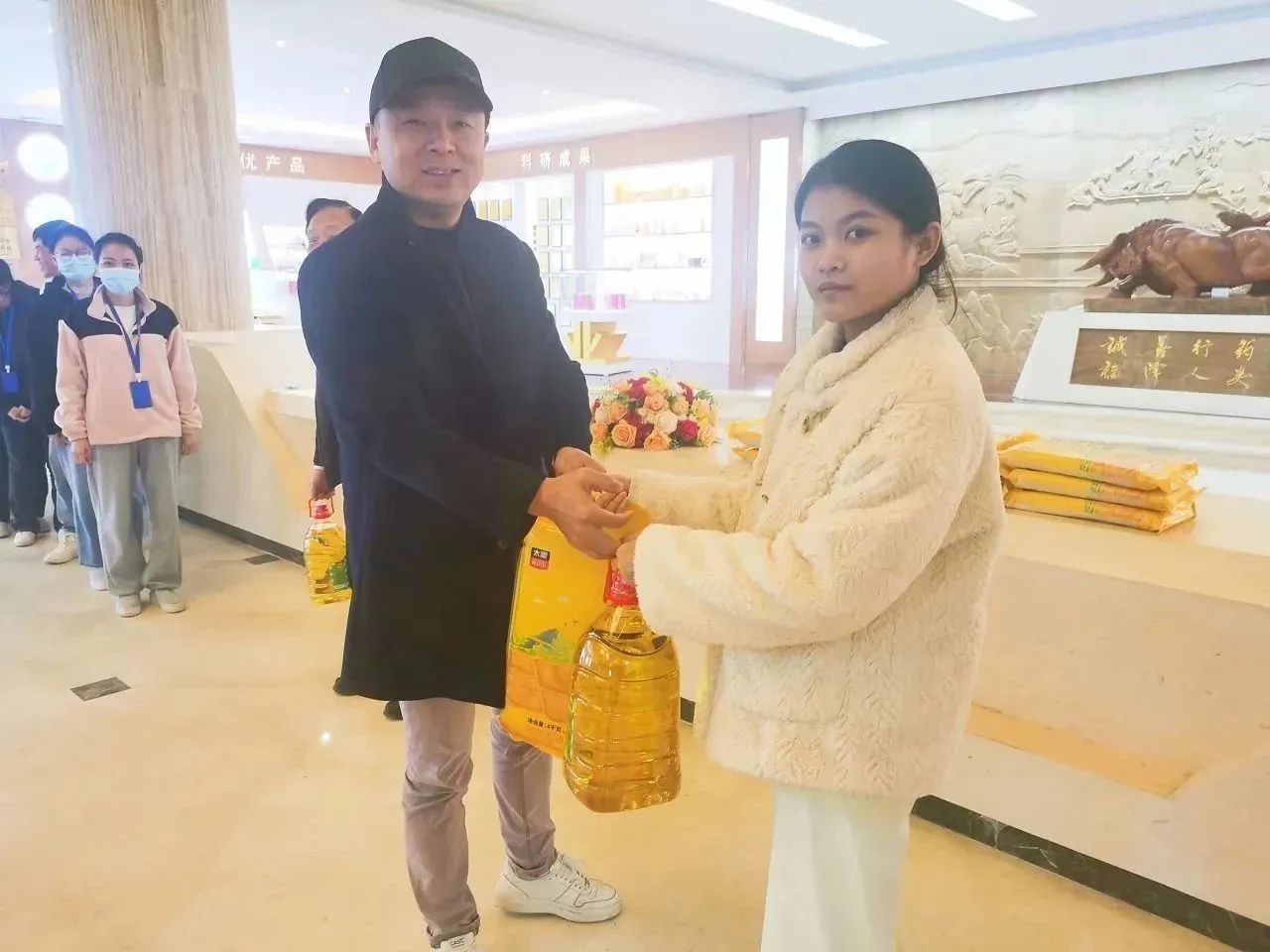 福利發(fā)放現(xiàn)場(chǎng)秩序井然,董事長(zhǎng)辦公室何子群總也代表公司將滿載祝福的春節(jié)福利送到員工手中,拿到福利的每一位員工都洋溢著幸福的微笑。
