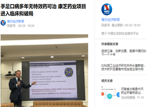近日,康芝藥業全資子公司收到國家藥品監督管理局下發的“注射用蘇拉明鈉”藥物臨床試驗批件。如果臨床試驗成功并獲許生產,蘇拉明鈉將成為全球首個治療手足口病的新藥。